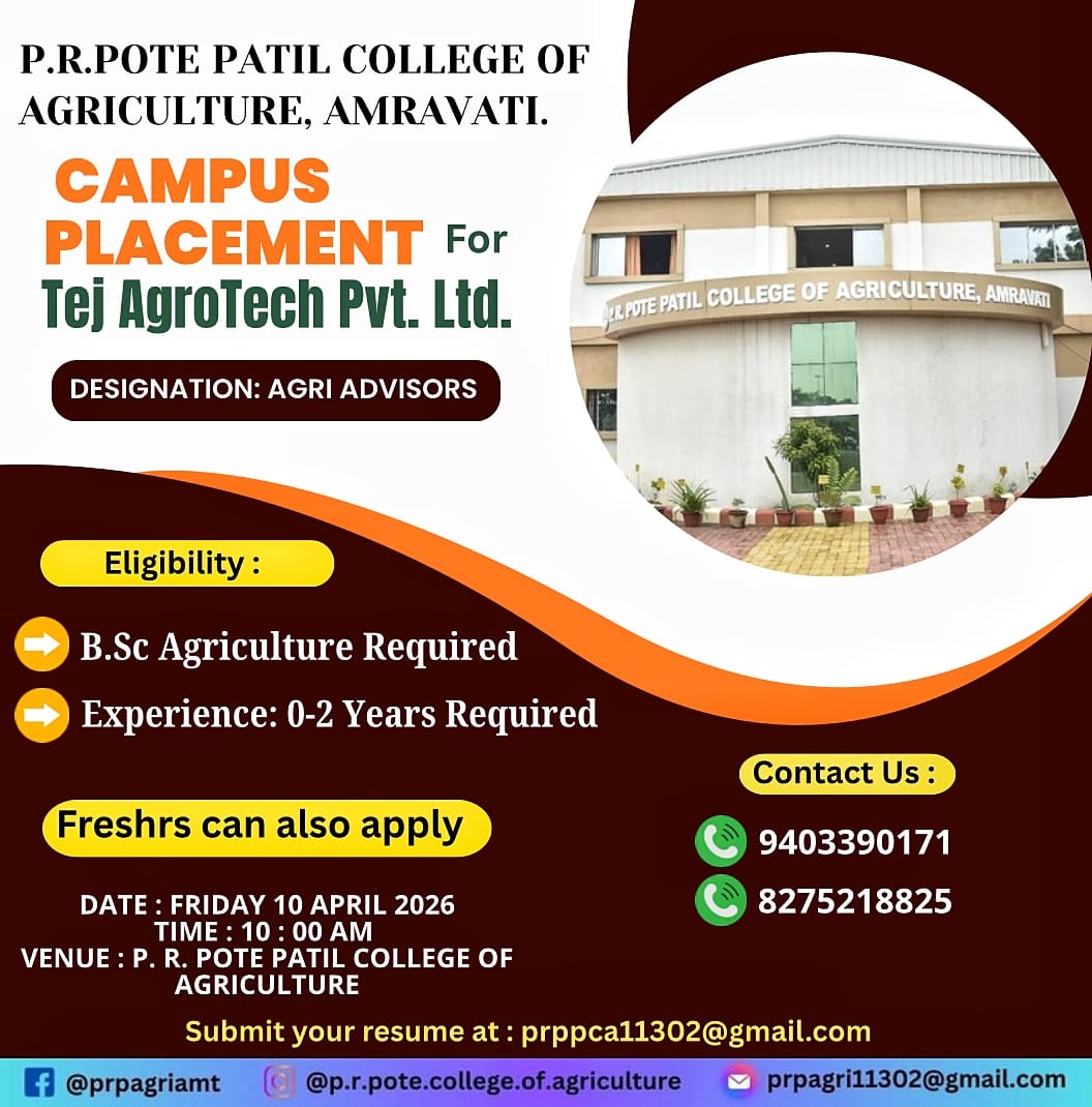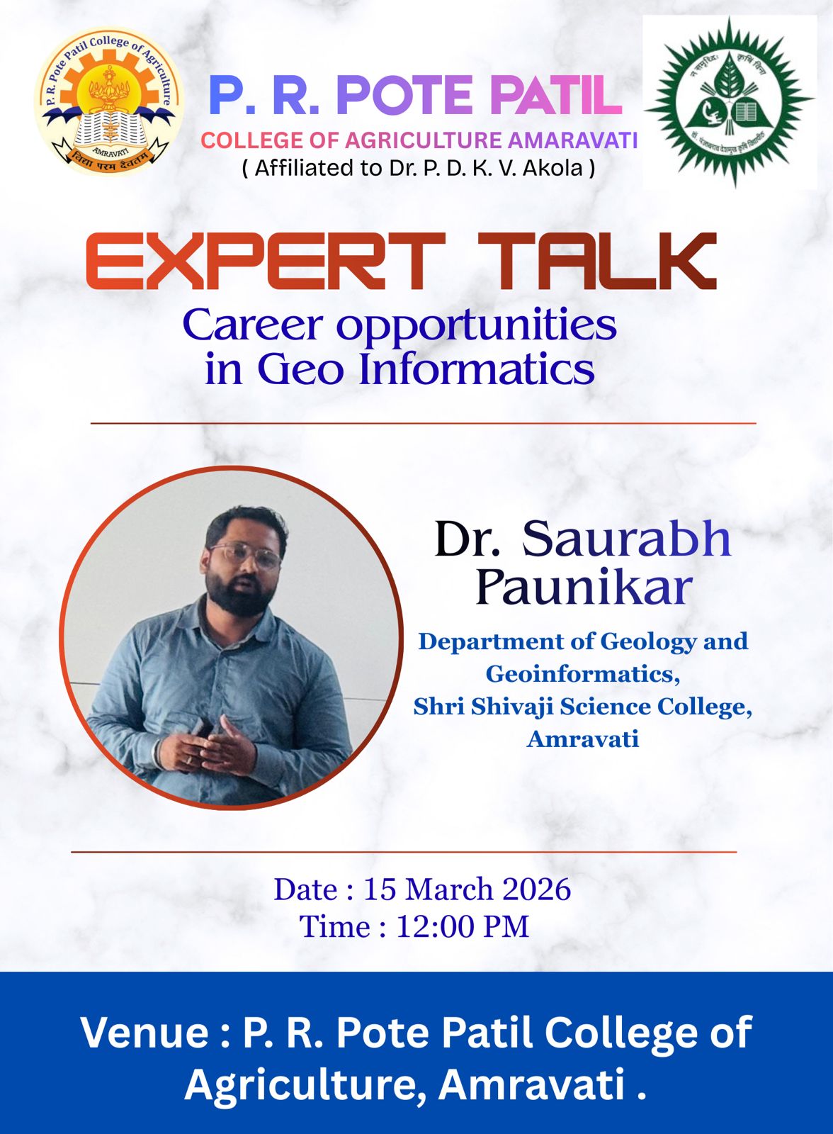 P. R. Pote Patil College of Agriculture, Amravati established in 2017 has now become one of the leading college to provide agricultural education with practical knowledge. To enhance the practical knowledge of students, college develop crop cafeteria in Kharif and Rabi season, also runs project of dairy, vermicompost, hydroponics, poultry, greenhouse, mushroom production unit, sericulture unit, trichoderma, vegetable and flower production unit, mother orchard etc. To provide quality technical education and to sustain students in today’s competitive environment, college recruits and retain highly qualified and competent faculty. This college is affiliated to Dr. Panjabrao Deshmukh Krishi Vidyapeeth, Akola. The institute provide very high quality infrastructure and includes Wifi Campus, well equipped laboratories, well stocked library, seminar halls and Swami Vivekanand Auditorim having capacity of 10000 students.